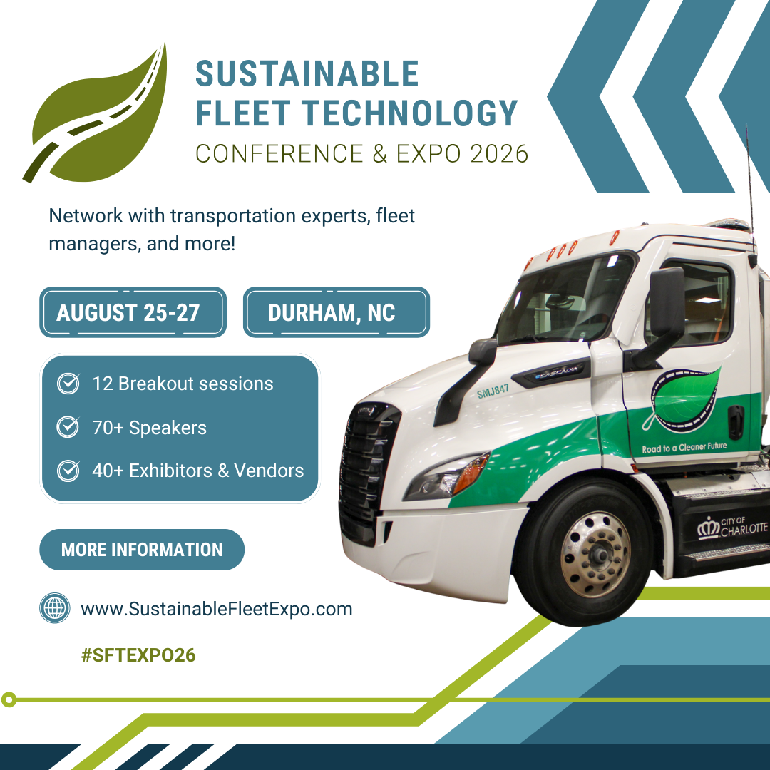 Join us at the 2026 Sustainable Fleet Technology Conference & Expo, hosted by @nccleantech! We’re excited to exhibit and network with experienced transportation experts and fleet managers on August 25-27 in Durham, NC. Visit www.sustainablefleetexpo.com to learn more and register for only $399! #SFTexpo26
