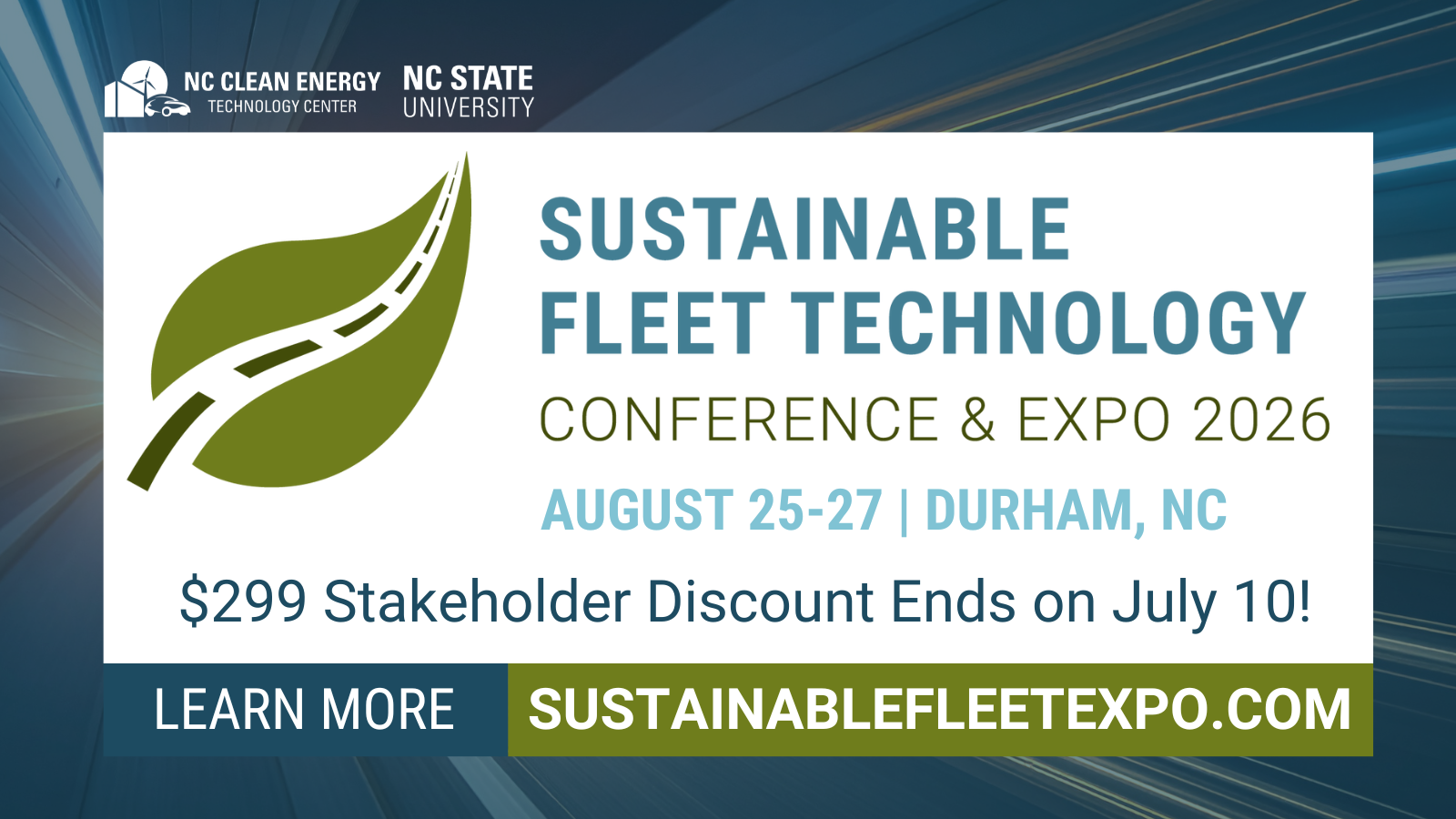 [Your organization] is a proud sponsor of the 2026 Sustainable Fleet Technology Conference & Expo, hosted by @nccleantech! We’re looking forward to creating new relationships & real business opportunities August 25-27 in Durham, NC. Learn more and register to join us for $399 at www.sustainablefleetexpo.com #SFTexpo26